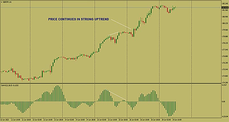 Sometimes divergences fail, especially the regular divergences. The chart below we see a regular divergence, notice that it’s just a minor retracement and price then continues in the original trend.