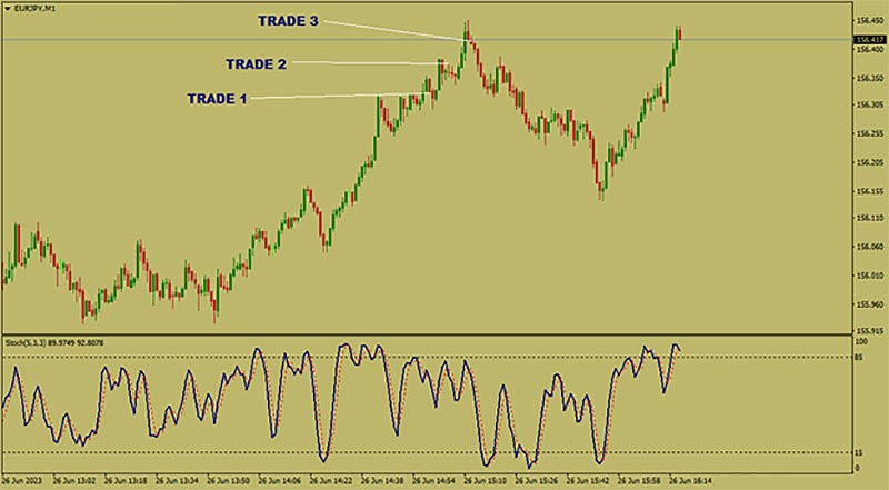 On the chart below, we get a sell entry signal on the EURJPY, i marked different points of trade, TRADE1, TRADE2 AND TRADE3