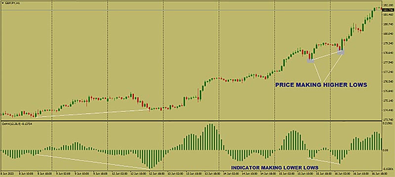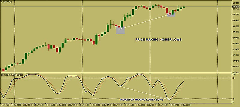 The Hidden divergence however is different in the sense that it is a signal of a trend continuation, and is identified when the reversal of a trend is ending and the trend wants to continue. Below is a bullish hidden divergence.