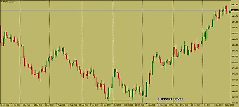 A support level is a point where price has reversed and continues in a bullish or upwards way. It is seen to be vital because in most cases price reacts when it approaches this level. When this happens within a price range it is called a Demand zone. We can draw support levels by connecting the lows on the chart and wait for price to attempt these levels.