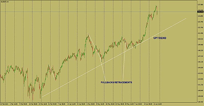 In an uptrend, when traders are buying a currency say EUR/USD (simultaneously buying euro and selling dollar), as the price continues to move up, more traders are joining the trend, and at point when we see a pullback/retracement, what is actually happening is that traders are closing some profits, they are actually doing the opposite(selling the euro and buying the dollar) but because there are more buyers than sellers, when the volume of the close or sell orders are surpassed by the buyers in the market we notice that the price continues in the uptrend.