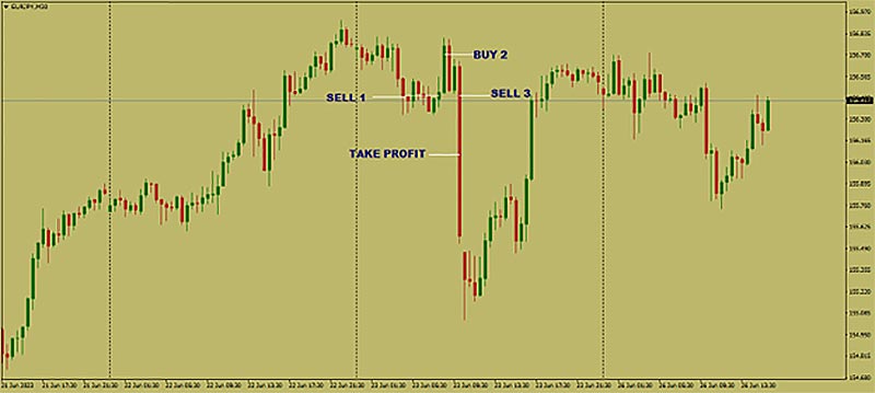 In the chart above, let’s say there is a signal to trade, we take the first trade SELL1 with 1 lot at Stop loss of 30 pips and take profit of 30 pips, when price moves against the trade and gets to our stop loss, we have a BUY2 of 2 lots with stop of 30 pips and tp of 30 pips, but as news came out and the price again goes down to the stop loss of BUY2 and we open a SELL3 trade with 4 lots which eventually hits the target , when we check the aggregate of all trades (4×30)+(2x-30)+(1x-30)=$30. The trader can of course adjust lot sizes, take profits and stop-loss to manage risk and outcome of the hedge.
