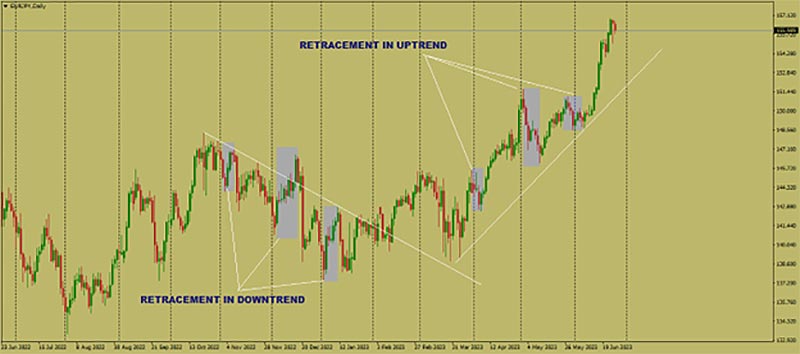 The chart below shows the EURJPY on the Daily time frame, we can see clearly that as the market moves in a down trend there are times when it shifts in a bullish fashion, these are call retracements or pullbacks, the same thing is identified when it’s moving in a bullish or uptrend, we also see that there are downwards retracements that occur before it continues in the original direction. These retracements when viewed on the lower time frame can be seen as a normal trend if one just views only that time frame.